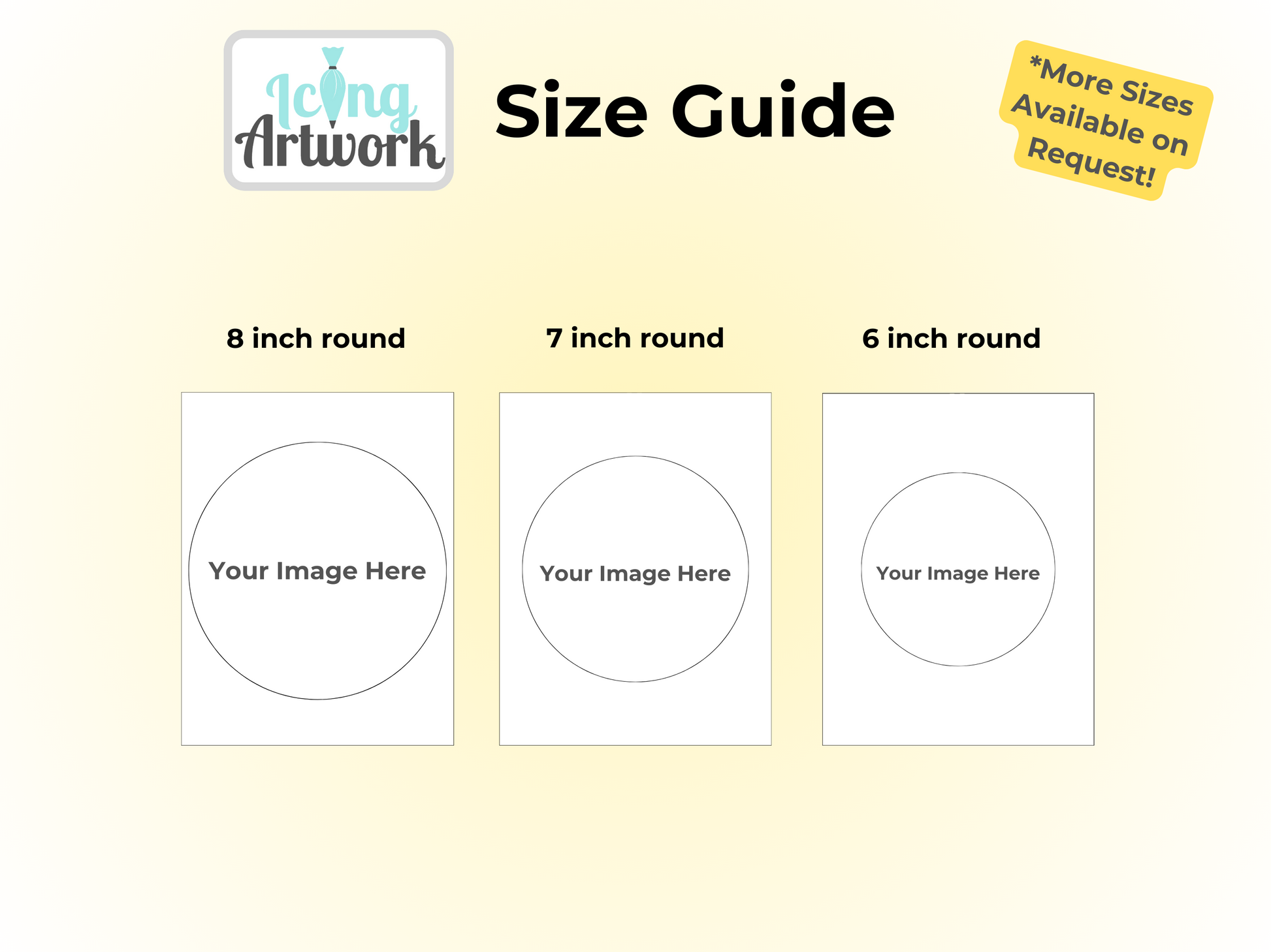 ♥ Circles: 8″, 7″, 6″ circle. They’re perfect for piping borders or even words across the picture without ruining the topper. If you’re concerned about covering important details close to the edge when piping a border, consider downsizing for more space.