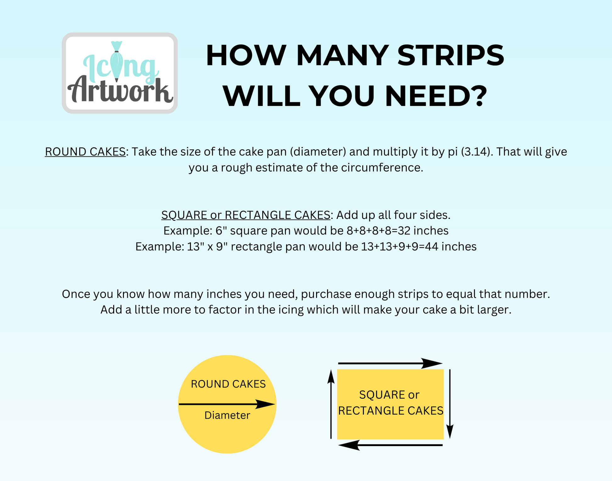 Square or Rectangular Cake - Add up all four sides to get the total length of how many strips you will need to wrap your cake.