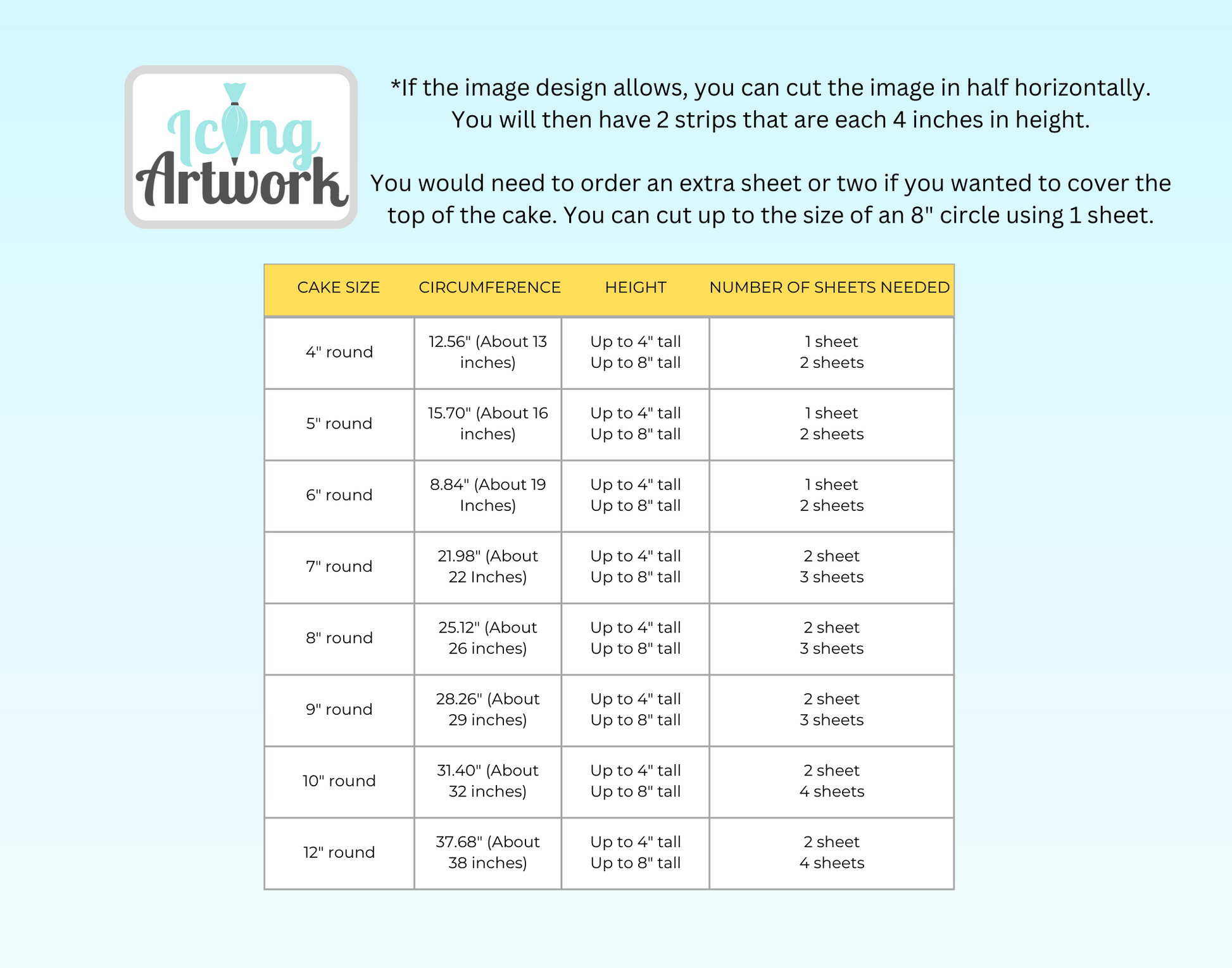 *Order an extra sheet or two if you want to cover the top of the cake with a cake topper. You can cut up to the size of an 8" circle using 1 sheet.