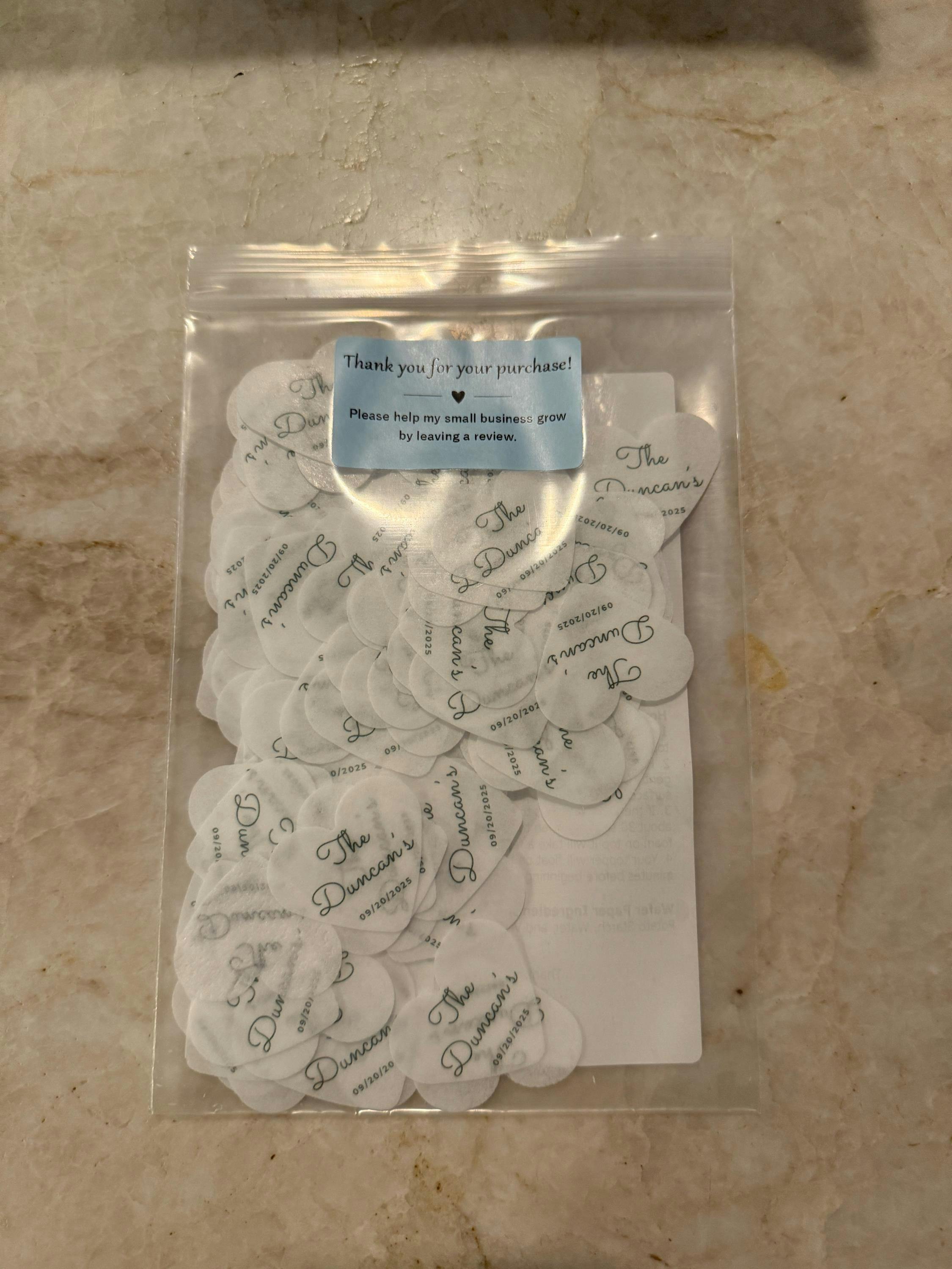 Elevate your special event with these custom, pre-cut edible drink toppers. These wafer paper toppers, printed with edible ink, can be used to top any hot or cold beverage. They will remain intact for around 20 minutes before they start to settle to the bottom of the glass. They do not dissolve.